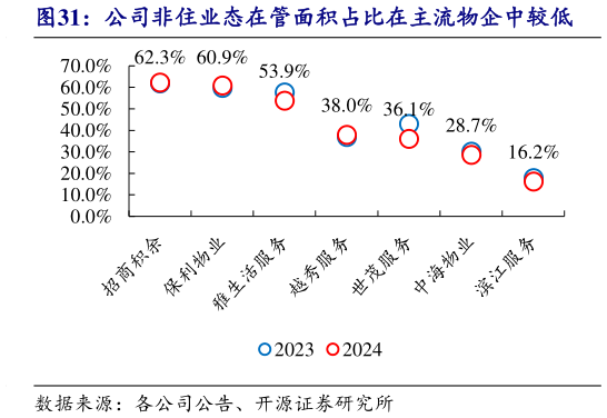 > 数据图表想问下各位网友公司非住业态在管面积占比在主流物企中较低2025-9-1公司自上市以来,在管项目中关联方占比由超 90%降至约 60%,市场化拓展路径清晰。2024 年公司在管面积中中建和中国海外集团占比 60.6%,同比提升 1.1pct,第三方占比 39.4%,占比在主流物企中仍较低。分业态看,2024 年公司在管面积中住宅占比 71.3%,同比提升 1.4pct,非住业态占比 28.7%,占比在主流物企中较低。开源证券综合其他