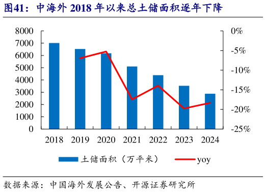 > 数据图表如何才能中海外 2018 年以来总土储面积逐年下降2025-9-1公司关联方中国海外发展 2024 年销售金额 3107 亿元,同比0.3%,权益销售规模行业第一,市占率提升至 3.21%销售均价 27047 元平,同比16.6%,为公司提供优质的高单价在管项目。中海外 2024 年新增 22 宗土地,购地金额 806 亿元,权益比 86%,拿地规模行业第一,其中一线城市占比 77%。截至 2024 年末,中海外(不含中海宏洋)总土储 2877 万方,权益比 88%,一线强二线城市占比 85%,未来中海外在北京、上海、深圳的高端楼盘陆续交付,有望使公司物业管理费明显上涨,进一步推动基础物管毛利率的优化提升。开源证券综合其他