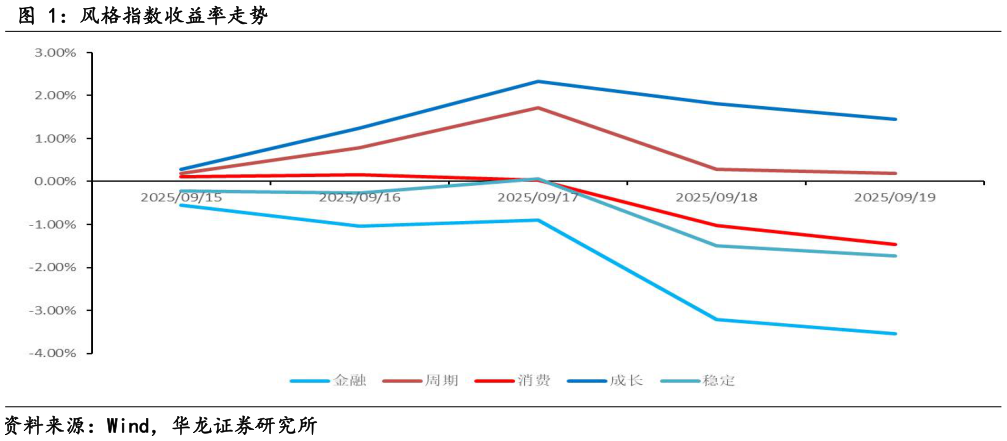 > 数据图表如何了解风格指数收益率走势2025-9-01成长风格韧性突出上周风格指数有所分化,成长风格在周四各风格指数整体调整中仍表现出明显的韧性。从上周风格指数区间平均涨跌幅来看,成长和周期指数分别上涨 0.29%和 0.04%,而其他风格指数均出现调整,其中金融风格有较为明显的调整,成长近来表现较好的重要原因之一在于业绩的持续性和较高的景气度,以及中长期的政策支持预期。华龙证券综合其他