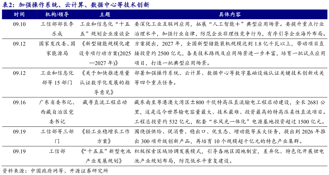 > 数据图表谁知道加强操作系统、云计算、数据中心等技术创新2025-9-1基建与产业方面,近两周政策聚焦工业和信息化“十五五”规划企业座谈会,会议讨论了工业互联网应用、“人工智能”典型应用场景等轻工业稳增长工作方案、关于加快推进质量认证数字化发展的指导意见、“十五五”新型电池产业发展规划等方案出台,围绕数字化和新能源等新兴产业,或为“十五五”规划重点领域。开源证券综合其他