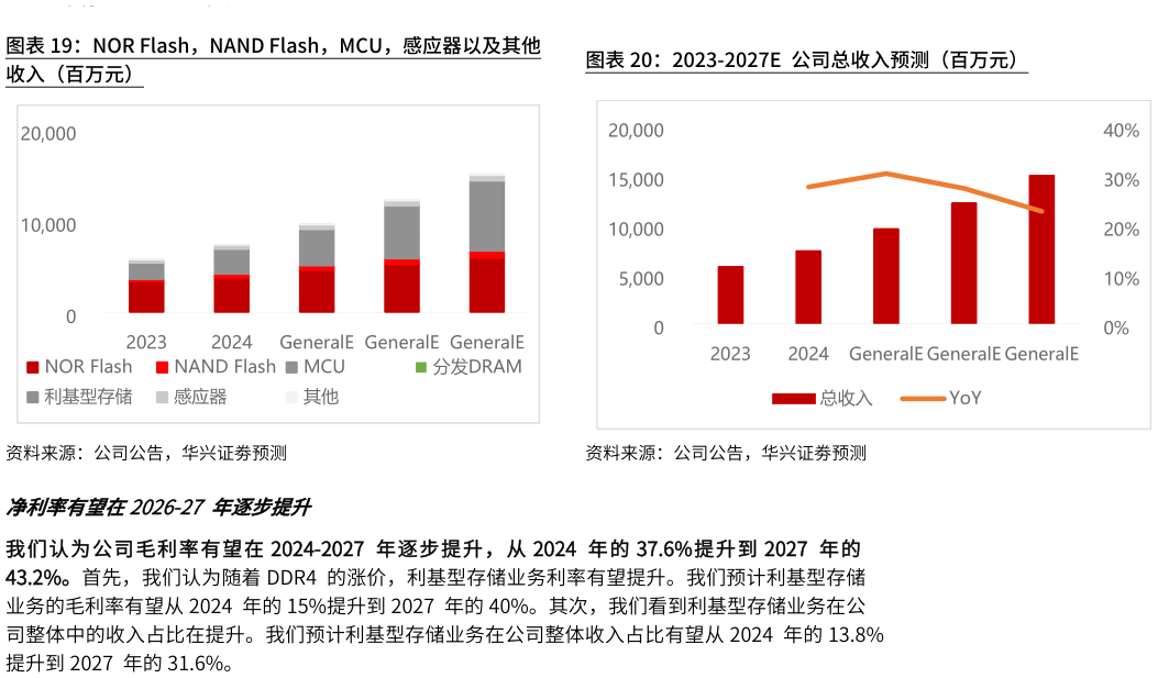 > 数据图表如何看待2023-2027E 公司总收入预测(百万元)2025-9-1为什么是“买入”评级我们预计公司2025-2027 年以DDR4 为核心的存储业务收入有望超市场预期,支撑2025-2027 年净利润CAGR 为38%(FactSet 上市场一致预期是28%)。我们首次覆盖兆易创新,给予“买入”评级,目标价为226.50 元。为什么是现在我们看好 DDR4 控产叠加涨价有望拉动公司 2025-2026 年收入。由于 3Q25 的DDR4 合约价超出我们和市场预期,有望提升市场对DDR4 涨价拉动兆易创新2025-2026 年收入的预期。进入2026 年,市场或逐步交易存算一体存储业务放量对兆易创新的收入拉动。我们认为DDR4 在4Q25 合约价进一步延续上涨是公司股价的催化剂。我们买入公司基于以下三个原因: DDR4 控产叠加涨价有望拉动公司2025-2026 年收入。根据半导体产业纵横,美光科技和SK海力士从2025 年6 月开始通知客户DDR4 产品将进入停产阶段,总体DDR4 供应量将大幅减少。随着三星电子、SK 海力士和美光科技退出DDR4 和LPDDR4X 市场,我们看好兆易创新在2025-2026 年市占率提升的逻辑。我们同时看到利基型DDR3-DDR4 价格已出现明显上涨。TrendForce 指出考虑 PC、服务器和手机存储需求仍然坚挺,原厂控产或直接拉动利基型DDR3-DDR4 及PC、服务器和手机在3Q24 的存储价格。我们预计DDR4 合约价2025 年或同比上涨75%,并预计兆易创新2025 年DRAM 收入可达19.9 亿元。 存算一体存储收入或贡献收入。随着AI 端侧和大模型应用成熟,我们认为存算一体行业有望2025 至2028 年间迎来爆发式增长。根据QYResearch 研究显示,2022 年全球存算一体市场规模为4383 万美元,该机构预计到2029 年全球存算一体市场规模有望达到306.28 亿美元,2022-2029 年复合增长率高达154.68%。根据中国招标网,兆易创新通过长鑫发力AI 手机大模型推理场景的DRAM 存算一体芯片,我们相应看好兆易创新在AI 手机大模型的DRAM 存算一体芯片中市场空间。按照每部手机存算一体存储价值量18 美金(US36GB)以及兆易创新占据全球20%的市占率估算,我们预计兆易创新DRAM 存算一体业务空间在2028 年或达98 亿人民币。 NOR Flash 和SLC NAND 业务仍维持基本盘,市占率稳步扩张。根据Frost Sullivan,全球NOR Flash 市场规模在2024 年达到28 亿美元,并预计2025-2029 年CAGR 达到7.6%。全球SLC NAND 市场规模在2024 年达到23 亿美元,并预计2025-2029 年CAGR 达到5.8%。我们认为公司在NOR Flash 和SLC NAND 有望推出更多新品,并认为公司在NOR Flash 上市占率有望在2029 年达到26.2%。我们预计公司在 NOR Flash 上市占率有望在2029 年达到5.2%。 我们认为催化剂主要包括:1)兆易创新2H25 和2026 年收入或充分受益于DDR4 涨价以及DDR5 产品价格上涨。2)公司正通过长鑫项目积极发力面向AI 手机大模型推理场景的DRAM存算一体芯片。该项目预计到2027 年底,销售DRAM 存算一体芯片不低于1000 颗,推动AI手机大模型技术应用落地。3)我们认为市场有望提振对于兆易创新在DRAM 存算一体的信心和潜力。首次覆盖并给予买入评级,目标价226.5 元:我们目标价基于42.0 倍的公司2027 年PE 估值,大概有3%的行业平均估值(40.74 倍)溢价。我们给予兆易创新估值溢价的原因兆易创新2025-27财年净利CAGR 是38%,高于行业平均水平(28%)。我们目标价对应的估值是42 倍2027 年PE,基本和兆易创新过去五年的24 个月动态PE 估值中值相当。华兴证券综合其他