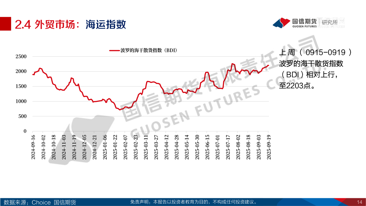 > 数据图表想关注一下2.4 外贸市场:海运指数2025-9-02.4 外贸市场:海运指数研究所上 周 ( 0915-0919 )波罗的海干散货指数(BDI)相对上行,至2203点。数据来源:Choice 国信期货免责声明:本报告以投资者教育为目的,不构成任何投资建议。14国信期货综合其他