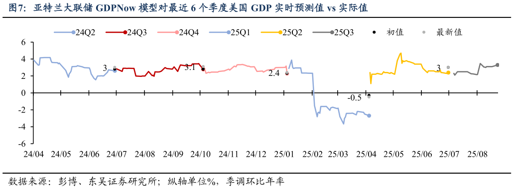 > 数据图表你知道亚特兰大联储 GDPNow 模型对最近 6 个季度美国 GDP 实时预测值 vs 实际值2025-9-0 海外政治:两党临时支出法案均未通过,联邦政府 10 月停摆风险升温。美东时间 9 月 19 日,共和党与民主党提出的临时支出议案在参议院投票中均未达到 60 票门槛,两党的拨款方案均宣告失败。双方在预算支出上的“僵局”源于在医保政策上的核心分歧:共和党主张通过约 1.5万亿美元,不含医保补贴的短期拨款,以维持政府运转至 11 月 21 日,并将医保补贴等争议留至 12 月进行协商而民主党则坚持将延长平价医疗法案(ACA)补贴相关条款纳入法案,双方因此争执不下。由于现存的支出法案仅能维持政府运转到 9 月底,因此若未来两党不能尽快就支出内容达成一致,则联邦政府 10 月 1 日停摆的风险将大幅升温,届时政治环境不确定性的风险或再度加剧市场波动。 风险提示:特朗普政策超预期美联储降息幅度过大引发通胀反弹甚至失控美联储维持高利率水平时间过长,引发金融系统流动性危机。东吴证券综合其他