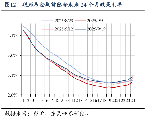 > 数据图表如何了解联邦基金期货隐含未来 24 个月政策利率2025-9-0 海外政治:两党临时支出法案均未通过,联邦政府 10 月停摆风险升温。美东时间 9 月 19 日,共和党与民主党提出的临时支出议案在参议院投票中均未达到 60 票门槛,两党的拨款方案均宣告失败。双方在预算支出上的“僵局”源于在医保政策上的核心分歧:共和党主张通过约 1.5万亿美元,不含医保补贴的短期拨款,以维持政府运转至 11 月 21 日,并将医保补贴等争议留至 12 月进行协商而民主党则坚持将延长平价医疗法案(ACA)补贴相关条款纳入法案,双方因此争执不下。由于现存的支出法案仅能维持政府运转到 9 月底,因此若未来两党不能尽快就支出内容达成一致,则联邦政府 10 月 1 日停摆的风险将大幅升温,届时政治环境不确定性的风险或再度加剧市场波动。 风险提示:特朗普政策超预期美联储降息幅度过大引发通胀反弹甚至失控美联储维持高利率水平时间过长,引发金融系统流动性危机。东吴证券综合其他