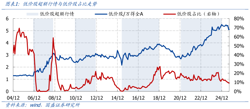 我们选择绝对股价作为标准筛选低价股,即逐月选取股价在 5 元以下的个股,并将 ST 个股予以剔除,在此基础上构建出“低价股指数”与“低价股占比”两项指标。 历史经验看,低价股超额行情与“消灭低价股”现象事实上是相悖的。2005 年至今,低价股共发生过四次跑赢万得全 A 的大级别超额行情,其中第一次低价股占比探底回升,且低价股超额行情结束时点的低价股占比要高于行情起点的占比水平,第二次、第三次低价股超额行情都出现了低价股占比不降反升的情况,第四次低价股超额行情期间,低价股占比则在一个较窄的区间内震荡。总结而言,低价股超额行情与低价股占比回落基本上不会同时存在。