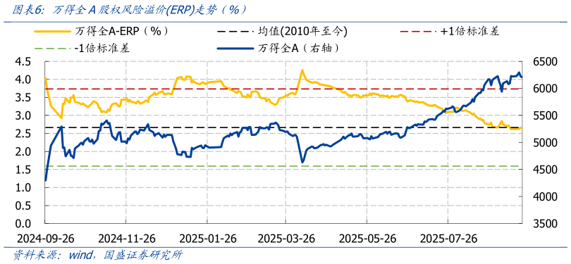 > 数据图表如何解释万得全A股权风险溢价ERP走势(%)2025-9-1行情表现:市场呈现冲高回落态势,美联储降息映射不明显本周市场呈现冲高回落态势,万得全 A 前三个交易日温和上涨,周四冲高后震荡回落、单日成交规模超 3 万亿,沪指也于同日触及 3899.96 的阶段高点,未能突破 3900 点关口,受产业事件催化,本周科技方向交易热点明显转向人形机器人与芯片产业链。美联储 9 月议息会议决议周内公布,如期降息 25bp,美股当日小幅冲高回落、表现较为平淡,也并未对 A 股产生明显映射。当前 A 股 ERP 为 2.65%,周内变动 1.77bp,反映市场风险偏好小幅降温。国盛证券综合其他