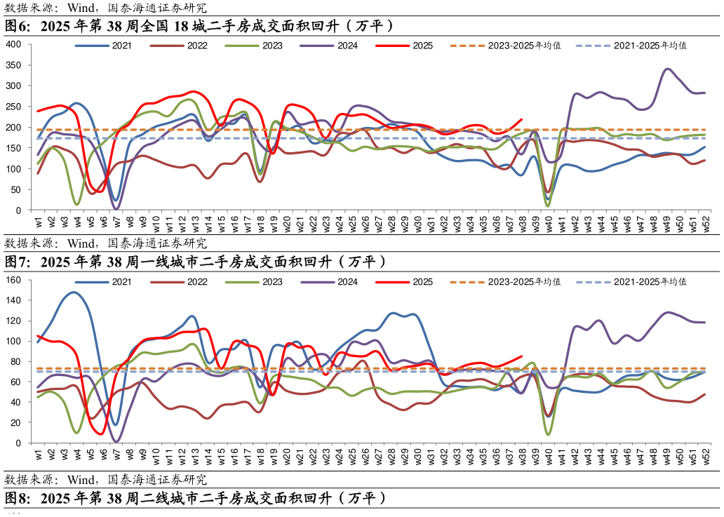> 数据图表如何看待2025 年第 38 周全国 18 城二手房成交面积回升(万平) 2025 年第 38 周一线城市二手房成交面积回升(万平)2025-9-1风险提示:地产调控和经济下行风险房企资金面紧张的风险。国泰海通公共服务