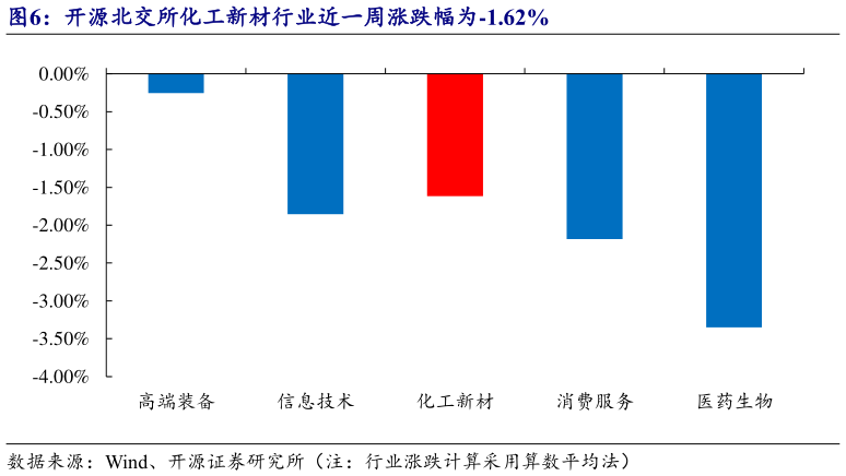 本周开源北交所五大行业整体表现弱势,出现不同程度的下跌,其中化工新材行业周涨跌幅为-1.62%。