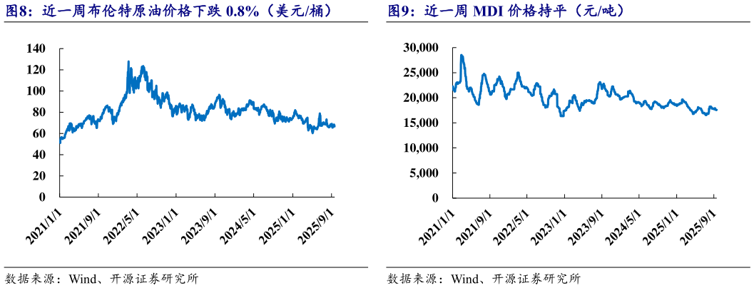 > 数据图表想问下各位网友近一周布伦特原油价格下跌 0.8%(美元桶)近一周 MDI 价格持平(元吨)2025-9-0本周开源北交所化工新材二级行业整体表现较弱,各子行业均出现不同程度的下跌,周涨跌幅分别为:橡胶和塑料制品业(-0.06%)、化学制品(-0.90%)、专业技术服务业(-1.81%)、纺织制造(-2.11%)、金属新材料(-2.54%)、电池材料(-3.93%)、开源证券科技传媒